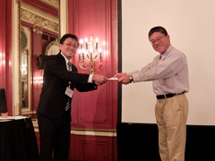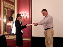(贈賞) ICRA2014の会場にて表彰を行い,表彰状および副賞を手渡します.
