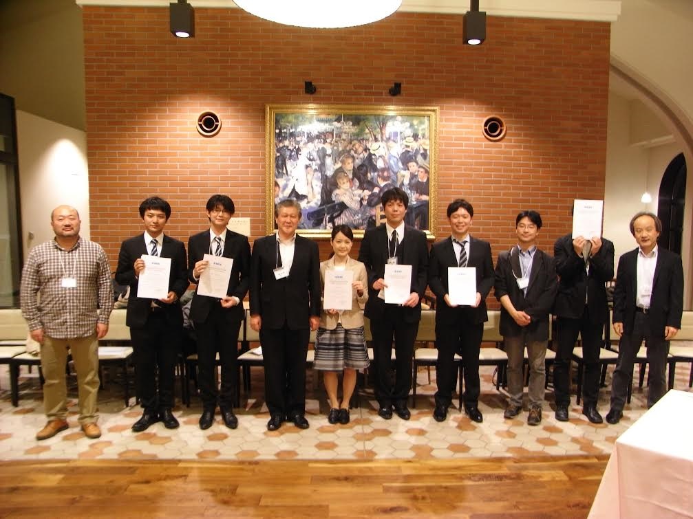 中本 俊(東京工業大学), ショウジョウバエにおける視野闘争の理論研究 ~ 視覚系の安定構造解析 ~ †伊藤 大輔(滋賀県立大学), 双極型ロジスティックカオスニューロンを用いたIsingネットワークの分岐 †常川 尚汰(大阪大学), 昆虫視覚系の運動検出モデルに学んだ小型自律飛行体のための自己運動推定システム †斎藤 尚美(愛知県立大学), 網膜視細胞モザイクのリアリスティックモデル †沖津 健吾(玉川大学), パブロフ-インストゥルメンタル転移を再現する計算論モデル †鈴木 聡志(電気通信大学), びまん性肺疾患識別におけるDeep Convolutional Neural Network特徴の解析 †左から青西先生、常川氏(*)、中本氏(*)、廣瀬先生、斎藤氏(*)、伊藤氏(*)、鈴木氏(*)、 庄野先生、沖津氏(*代理:酒井先生)、萩原先生 ((*)は受賞者、それ以外は運営委員) |