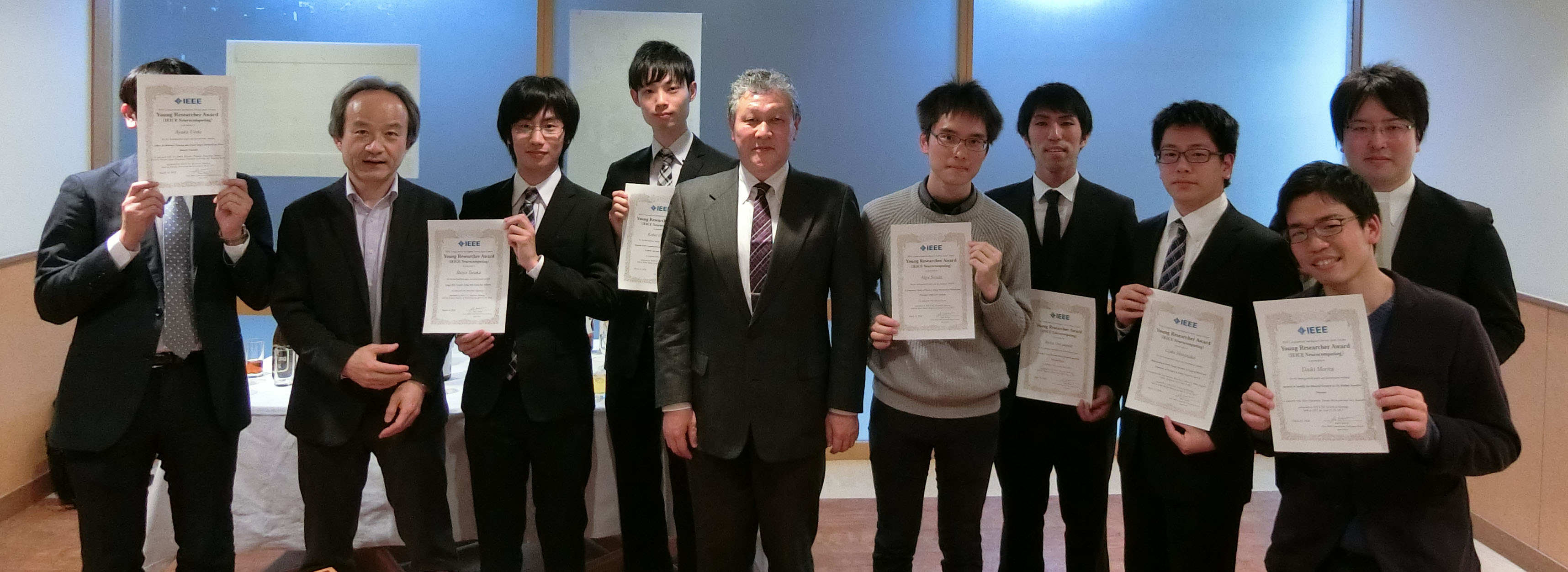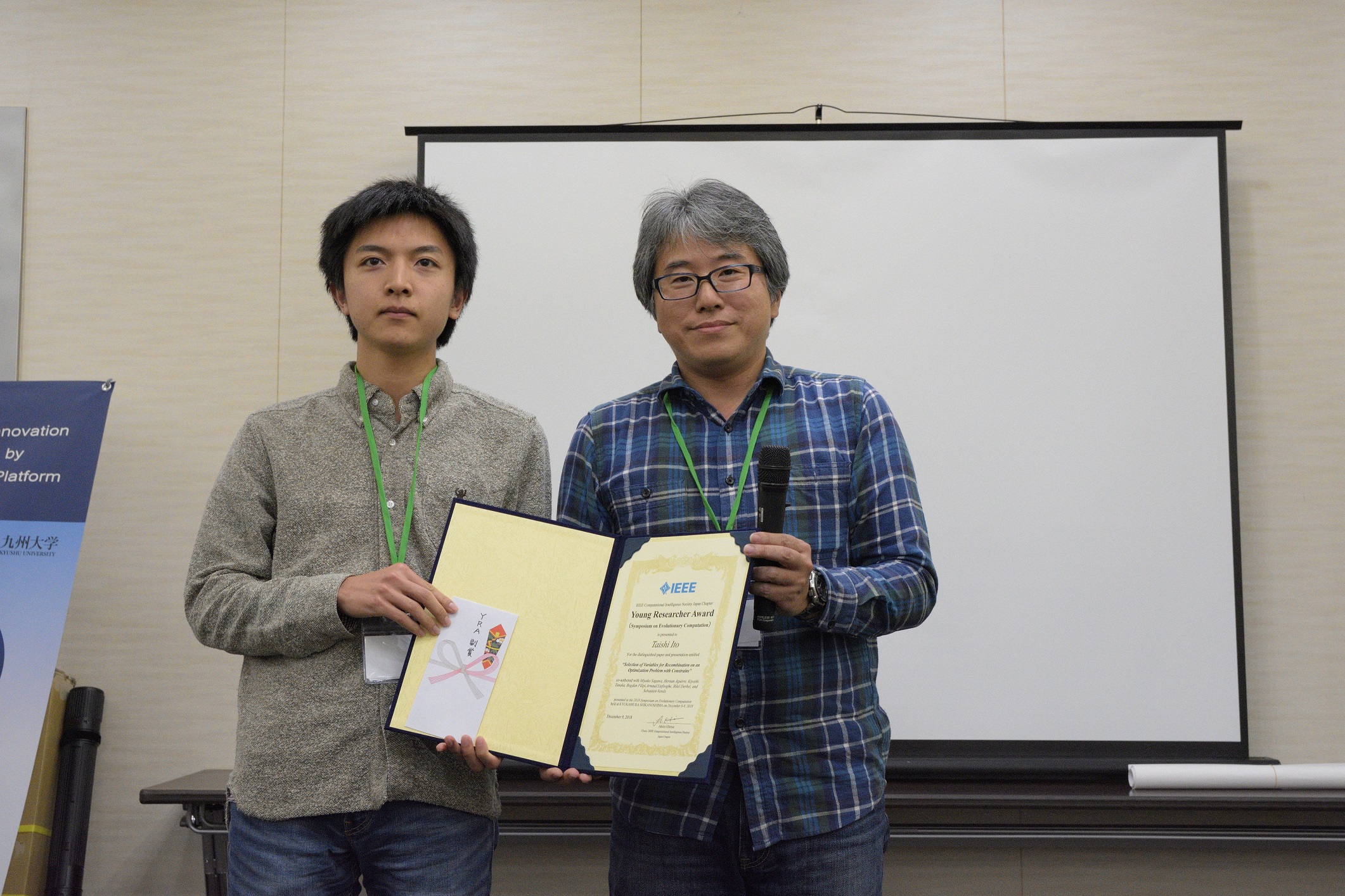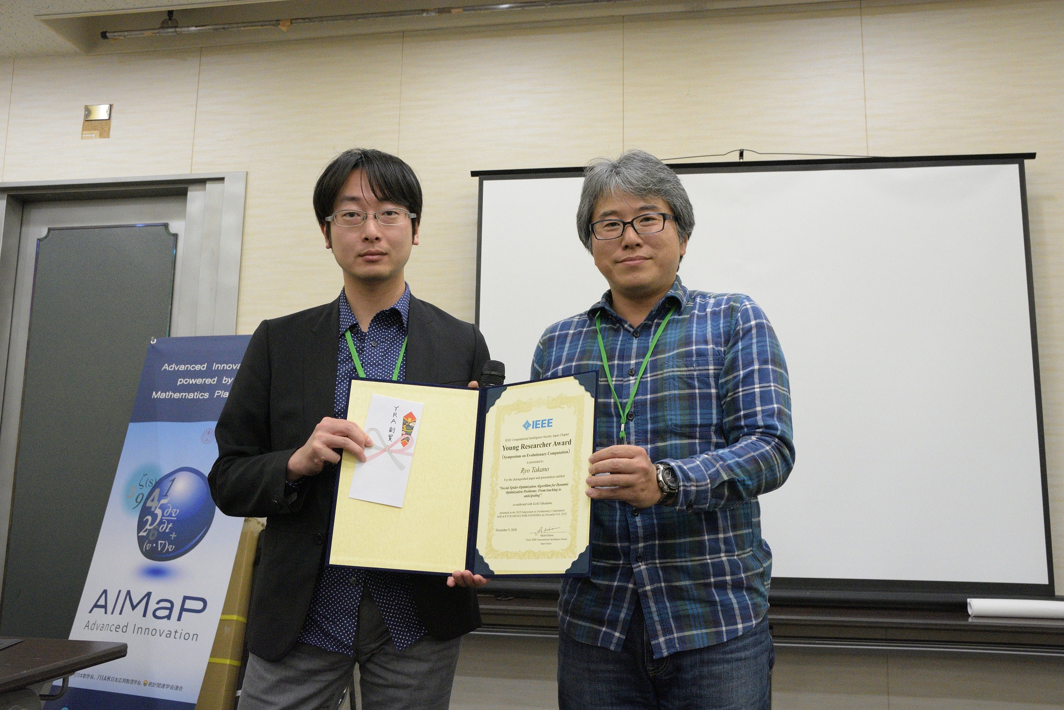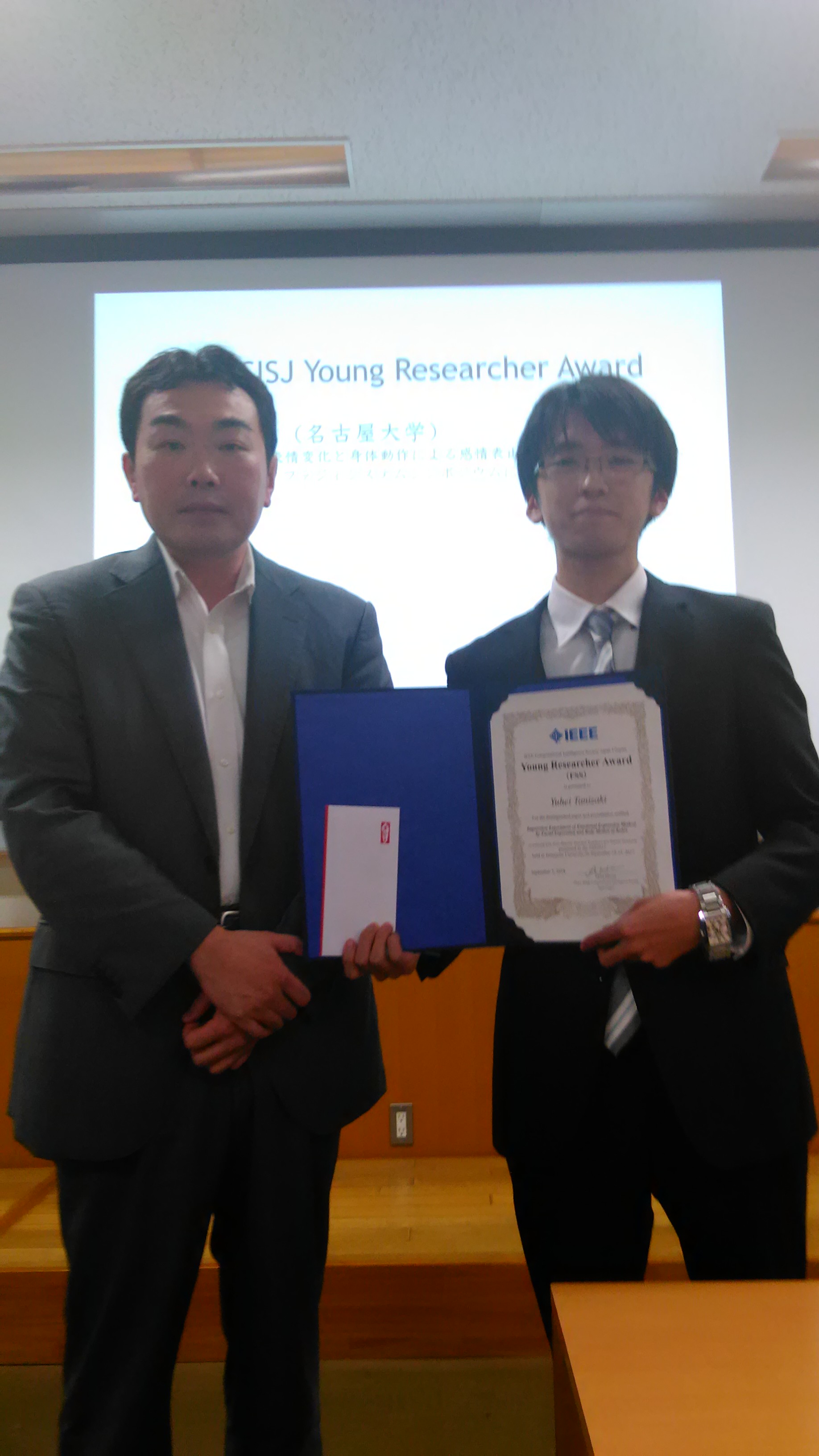 2018年受賞者 (Updated at 2021-12-22 (Wed) 13:30:51) †進化計算シンポジウム2018 †2018年12月8日~12月9日に開かれた進化計算シンポジウム2018での該当者から以下の3名が選ばれました. Yuri Marca(信州大学) NSGA-II with Spline Interpolation on Bi-objective Problems with Difficult Pareto Set Topology †高野 諒(電気通信大学) Social Spider Optimization Algorithmの動的最適化問題への適用:変化の追従から先回りへ †伊藤 大志(信州大学) 実問題に基づいた制約条件付き最適化における交叉変数選択手法の提案 †SCIS&ISIS2018 †2018年12月5日~12月8日に開かれたSCIS&ISIS2018(富山国際会議場)での該当者から以下の2名が選ばれました. Kana Fukui (Kwansei Gakuin University) A Perfusion System for Autonomous Energy Control of the Living Neuronal Circuit †Shotaro Furuta (Nagoya Institute of Technology) Efficient User-Searching of Hearing-Dog Robot in Consideration of User's Life Rhythm †(50音順) 第34回ファジィシステムシンポジウム(FSS2018) †2018年9月3日~9月5日に開かれたFSS2018(名古屋大学)にて,FSS2017での論文発表に対して選奨委員会により以下の1件をCISJ-YRAに選出し,表彰致しました. 谷嵜 悠平(名古屋大学)ロボットの表情変化と身体動作による感情表出法に関する印象実験 †ニューロコンピューティング(NC)研究会 †