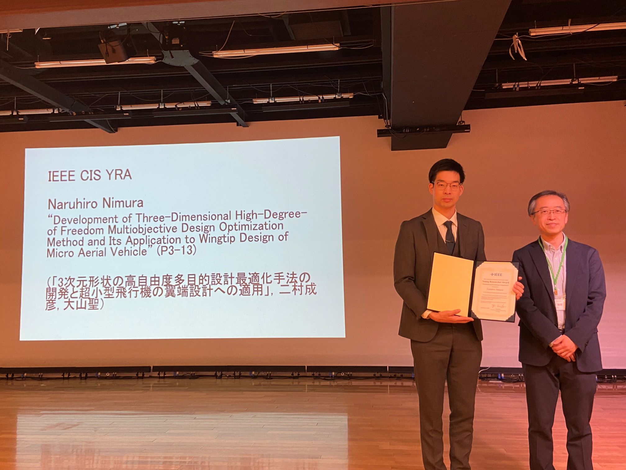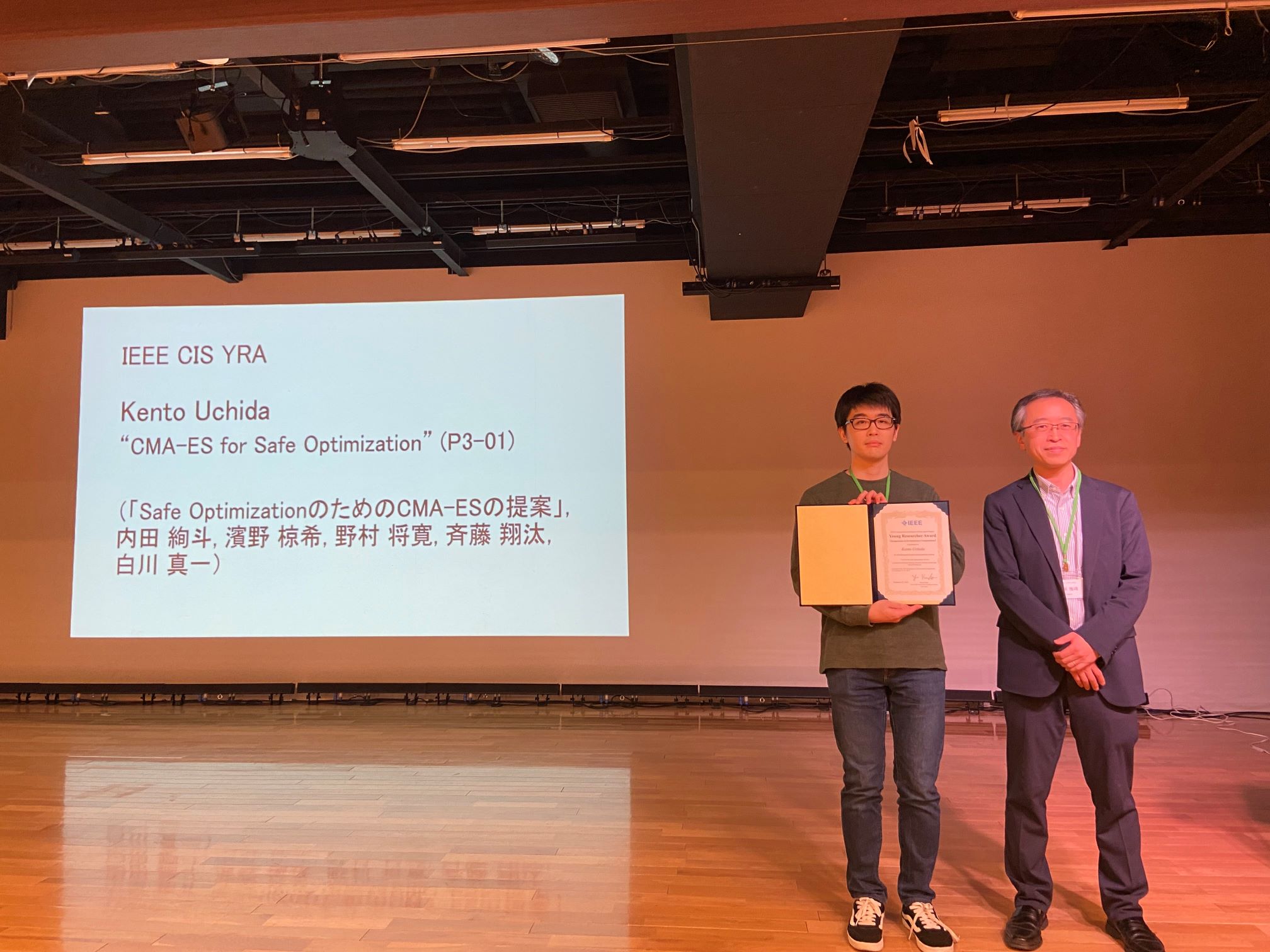 2023年受賞者 (Updated at 2024-05-04 (Sat) 17:21:18) †進化計算シンポジウム2023 †2023年12月21日~12月23日に開かれた進化計算シンポジウム2023(小田原お堀端コンベンションホール)での該当者から以下の2名が選ばれました. Kento Uchida (Yokohama National University) : CMA-ES for Safe Optimization †Naruhiro Nimura(University of Tokyo) : Development of Three-Dimensional High-Degree-of Freedom Multiobjective Design Optimization Method and Its Application to Wingtip Design of Micro Aerial Vehicle †第39回ファジィシステムシンポジウム(FSS2023) †FSS2022での論文発表に対して選奨委員会により以下の2件をCISJ-YRAに選出し,表彰致しました. 池田 仁俊(九州工業大学): パターン・ランゲージ生成のための人間ベース進化計算システムの評価方法 †藤田 実智斗(北海道大学): オノマトペ辞書に基づいたルールによるオノマトペ語義分類手法の提案 †現地参加された藤田氏のご紹介とご挨拶 ニューロコンピューティング(NC)研究会 †2022年3月から2023年1月までのNC研究会における該当発表者から5名の受賞者が選定されました.受賞者は下記の通りです. Jiaxuan Chen ジャシュアン・チェン (Univ. Tokyo): Basic Properties of Film-penetrating Transducers for a Spin-wave Reservoir Computing Chip †土田 淳 (名⼯⼤): 対話型遺伝的アルゴリズムを用いた擬音語に基づくFM音の生成手法 †白石 達寛(奈良先端⼤): 個人間校正と敵対的ドメイン適応を用いた脳波分類モデルの共通特徴量の抽出 †山本 陸(埼玉大): ホロノミック勾配法を用いた状態推定の連続時間系への適用 †河合 祐司 (大阪大): モジュール型レザバーコンピュータを用いたロボットアームの適応的な軌道制御 † |