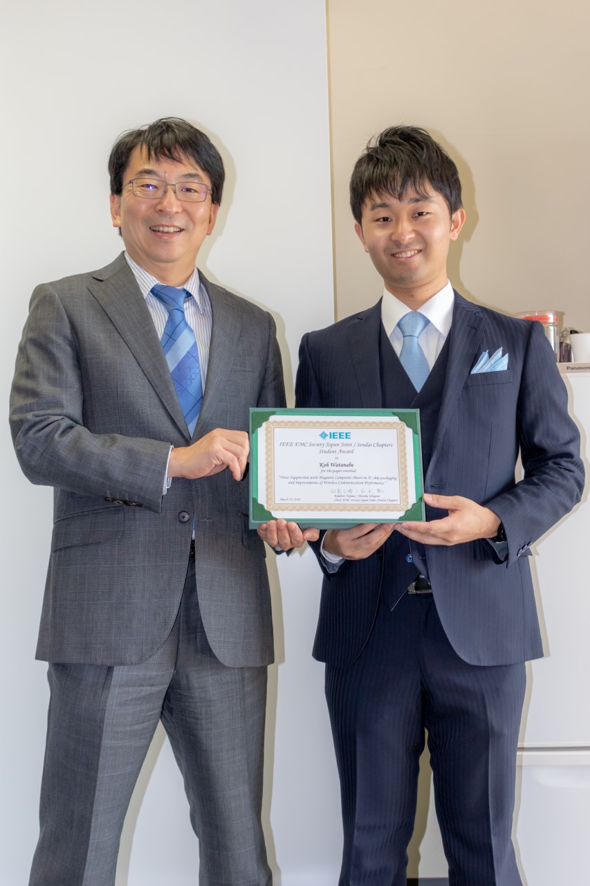 受賞者:渡邊 航 様(神戸大)(写真右) EMCJ2019-67 ICチップパッケージング内における磁性膜による不要電波抑制技術及び無線通信品質の向上