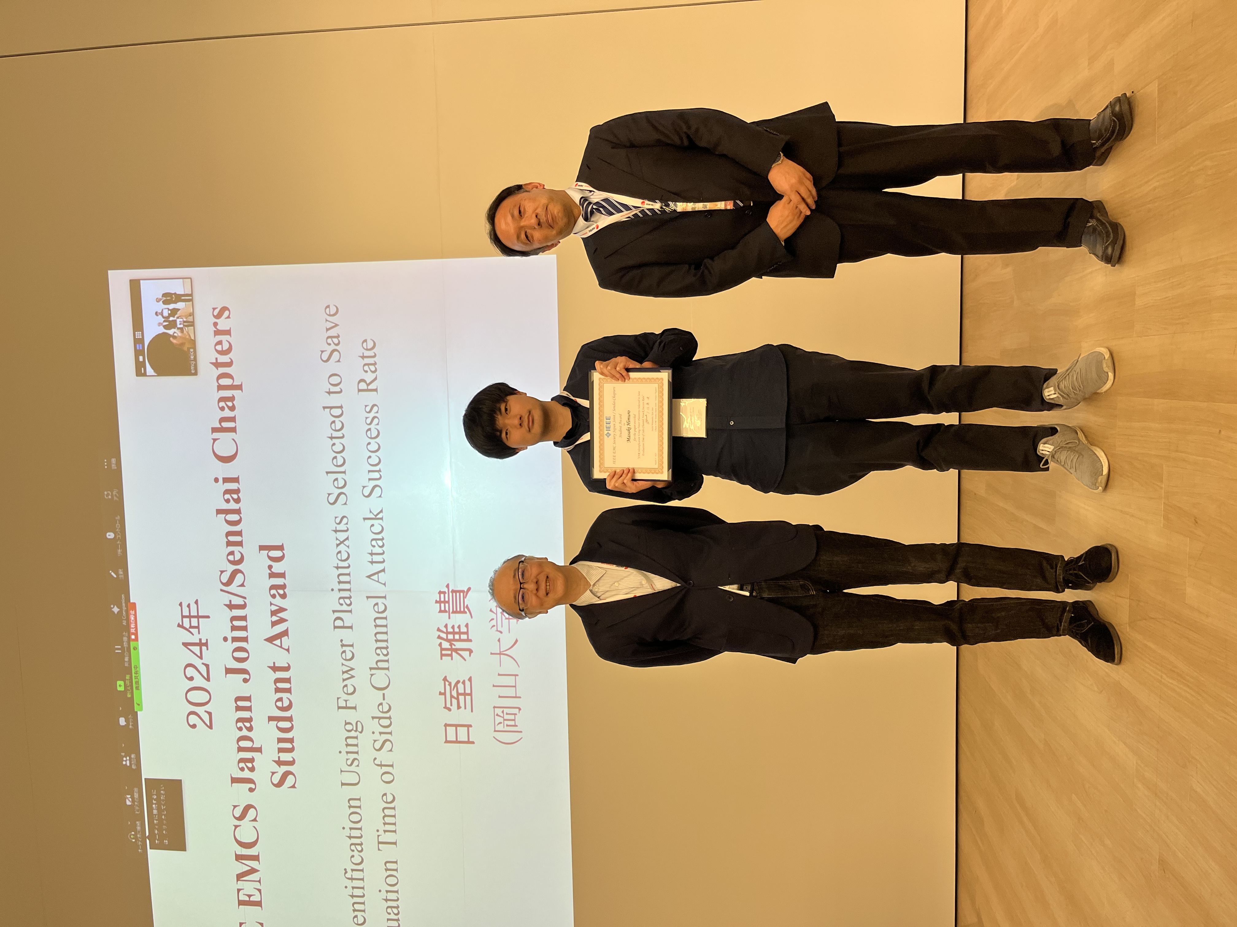 受賞者: 日室 雅貴 様(岡山大学) 受賞テーマ: " SNR Identification Using Fewer Plaintexts Selected to Save Evaluation Time of Side-Channel Attack Success Rate" (EMCJ2024-72; EMC Joint Workshop 2024, Bangkok, Thailand)
